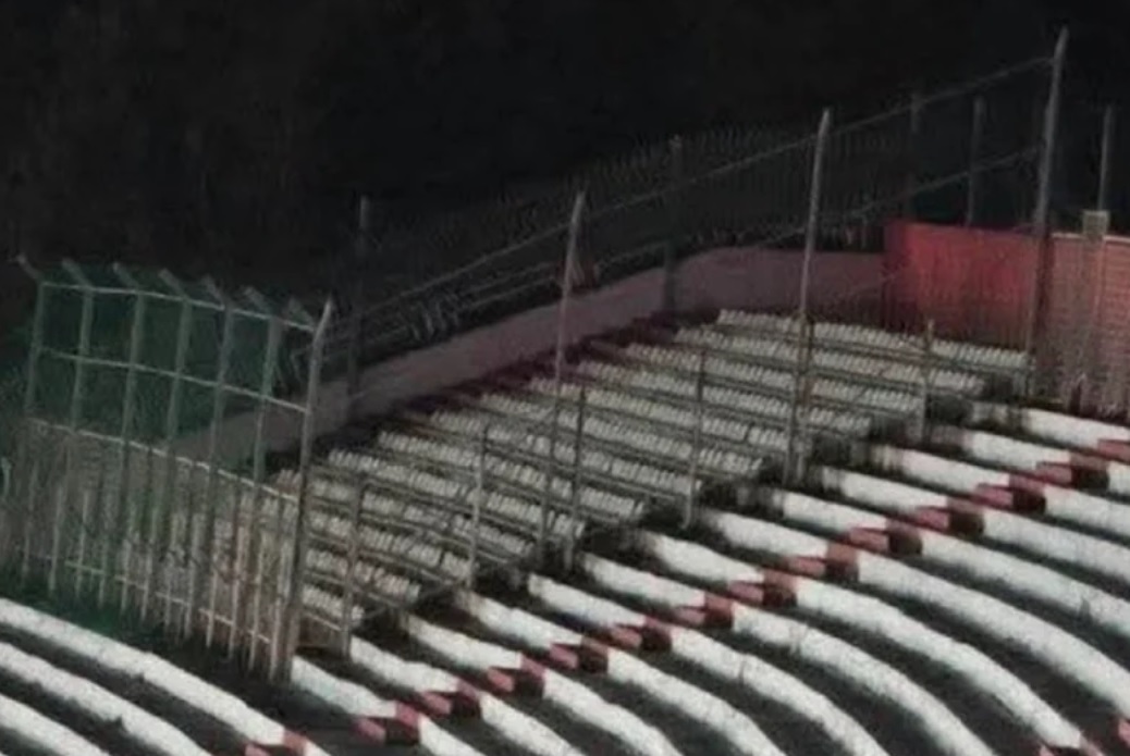 Fotografija prikazuje ograđeni sektor sa zaštitnim kavezom kakav se koristi na domaćim utakmicama u Premijer ligi BiH, što je za mnoge fanove u Engleskoj neuobičajen prizor i znatno drugačiji standard od onoga na koji su navikli na stadionima u svojoj zemlji.