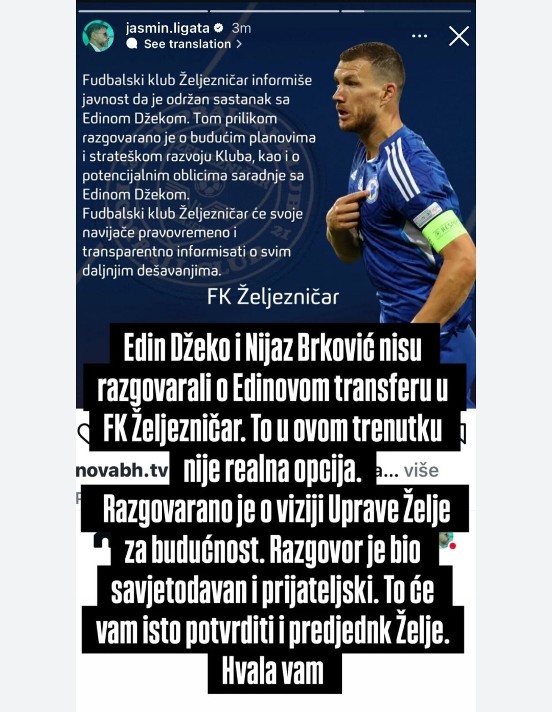 Povodom brojnih špekulacija koje su se pojavile u javnosti nakon sastanka Edina Džeke s predstavnicima FK Željezničar, oglasio se Jasmin Ligata, PR kapitena reprezentacije Bosne i Hercegovine, s ciljem da razjasni situaciju i zaustavi nagađanja.
