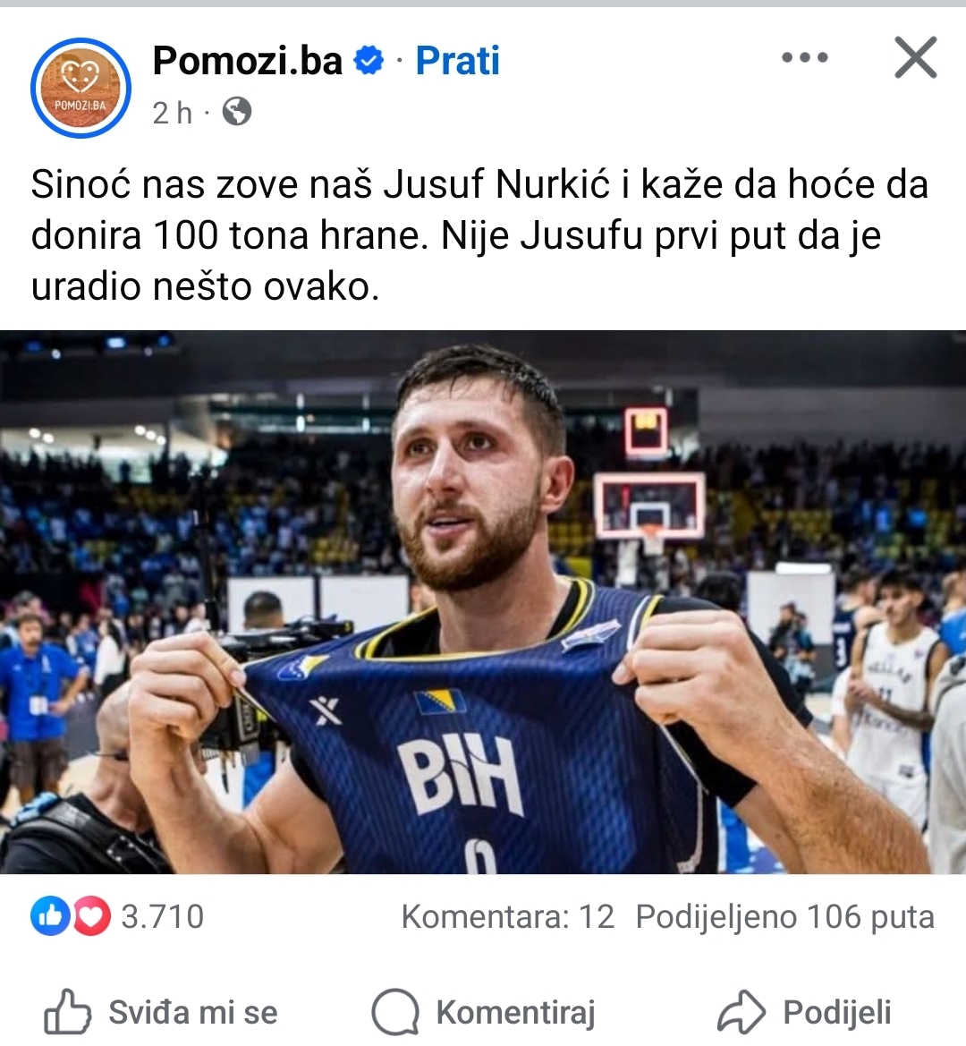 Kako su objavili iz humanitarne organizacije Pomozi.ba, Nurkić ih je sinoć kontaktirao s jasnom željom – da donira čak 100 tona hrane građanima širom Bosne i Hercegovine. Ova plemenita odluka dolazi u trenutku kada mnogim porodicama svaka pomoć znači mnogo, a Nurkić je još jednom dokazao da nikada ne zaboravlja svoju zemlju i narod.